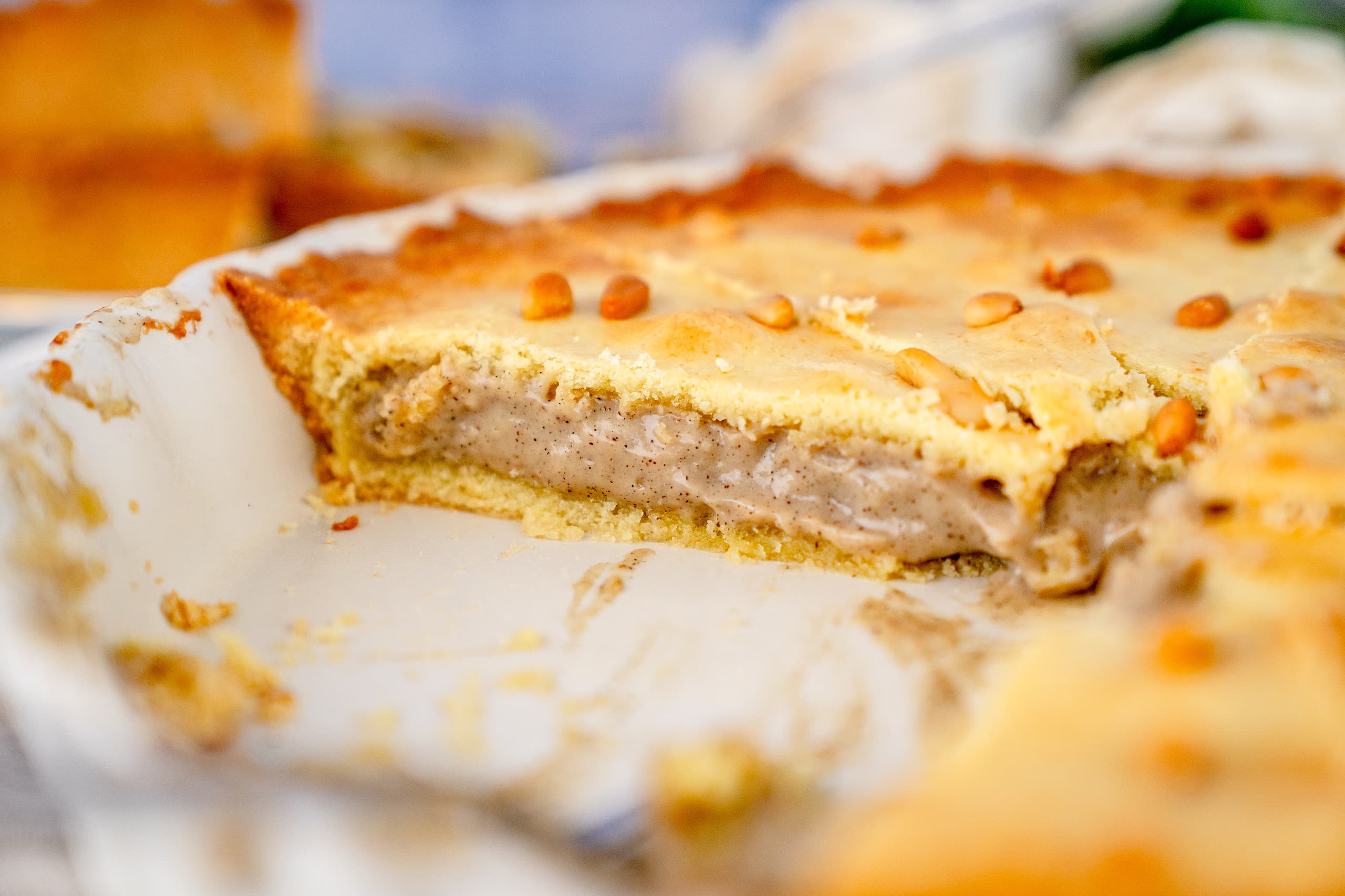 Den Mürbeteig aus dem Kühlschrank nehmen und 2/3 des Teiges auf einer leicht bemehlten Arbeitsfläche ausrollen, sodass sie mit Rand in die vorbereiteten Kuchenform als Boden passt. Vorsichtig hineinlegen und den Boden mit einer Gabel ein paar Mal einstechen. Dann die Vanillecreme hineingeben und mit ein paar Pinienkernen bestreuen.