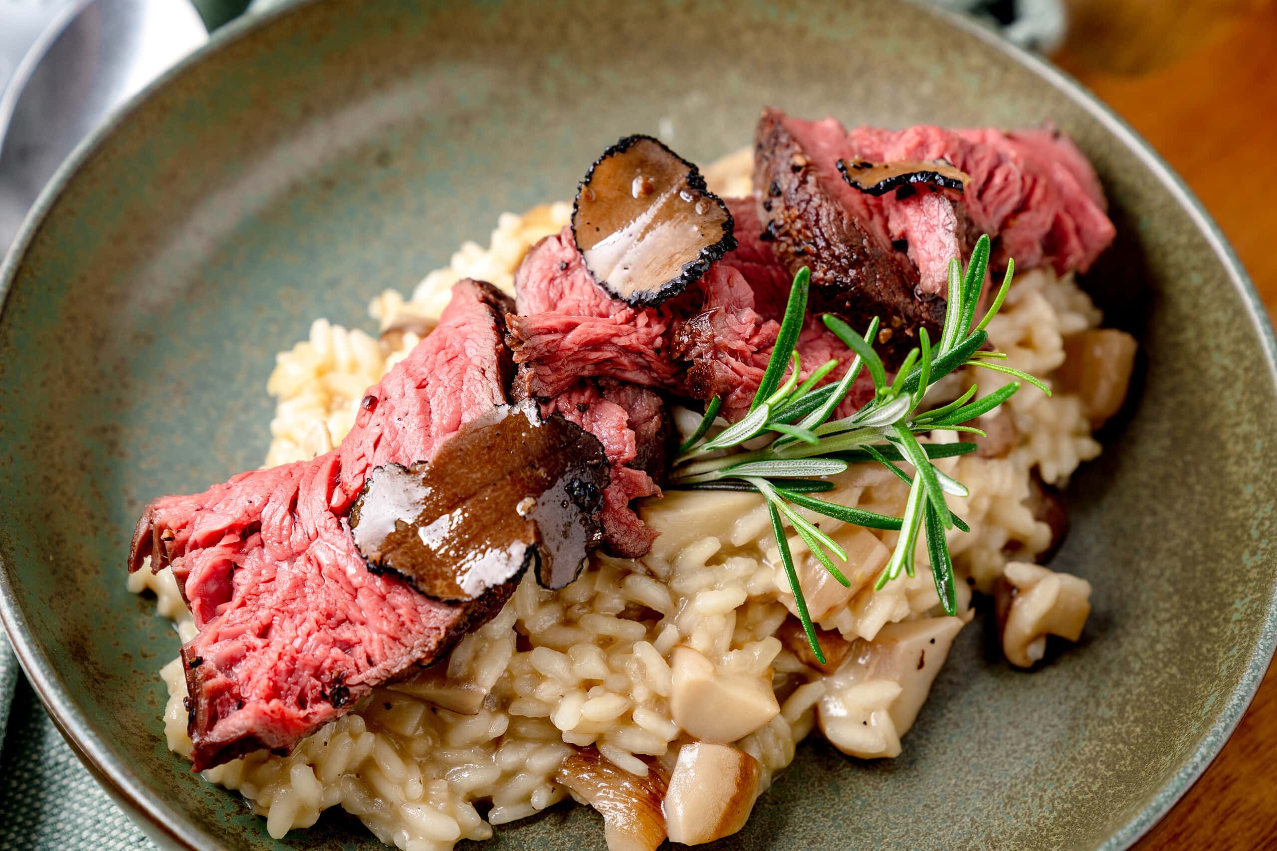 Rinderfilet in Scheiben schneiden und mit dem Risotto anrichten.