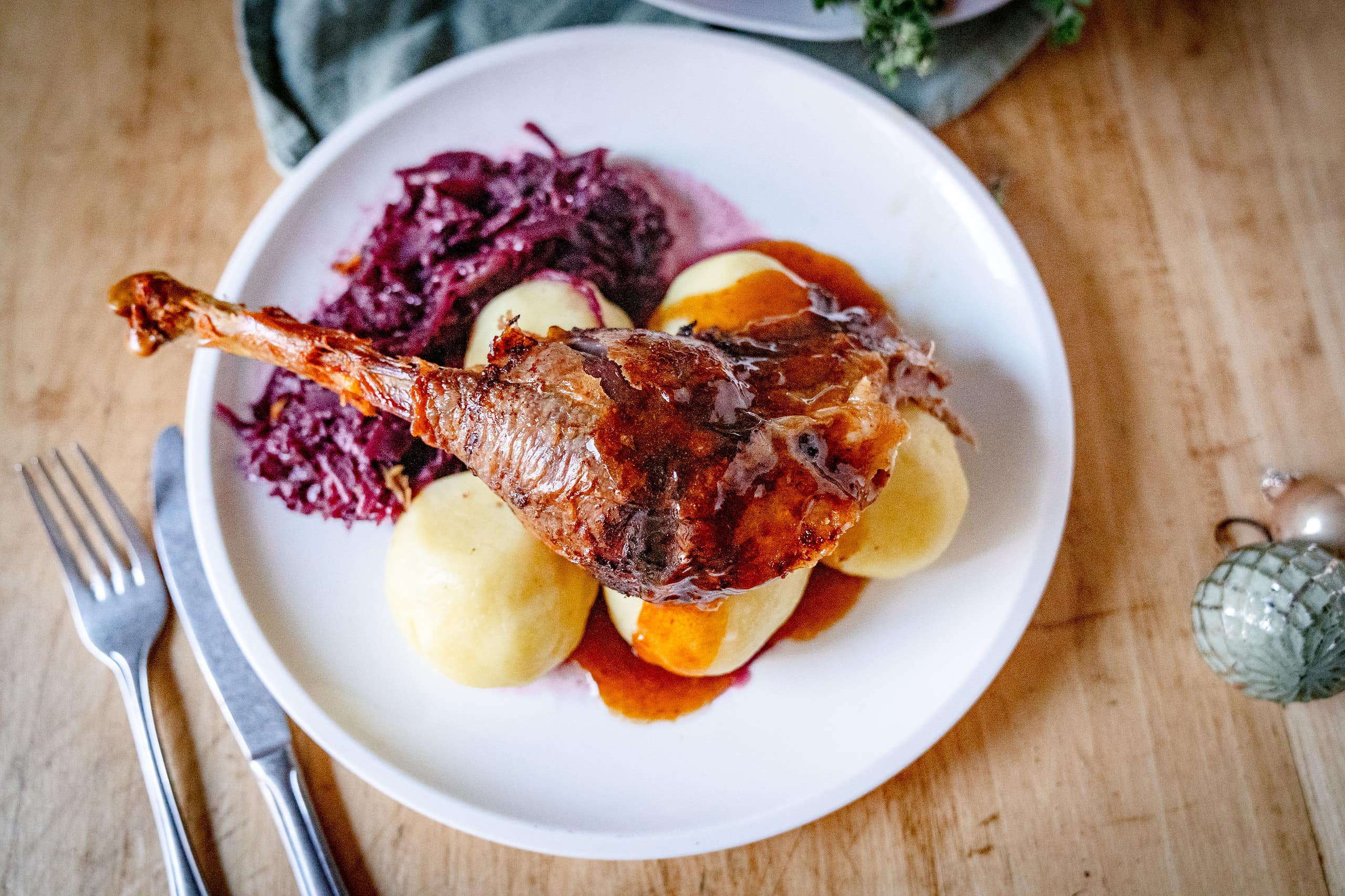 Nach Ablauf der 3 Stunden den Ofen auf 200°C Umluft hochheizen und ab diesem Zeitpunkt nochmal gut 30 Minuten Garen. Sobald die Gans von außen goldbraun ist, ist sie fertig.
