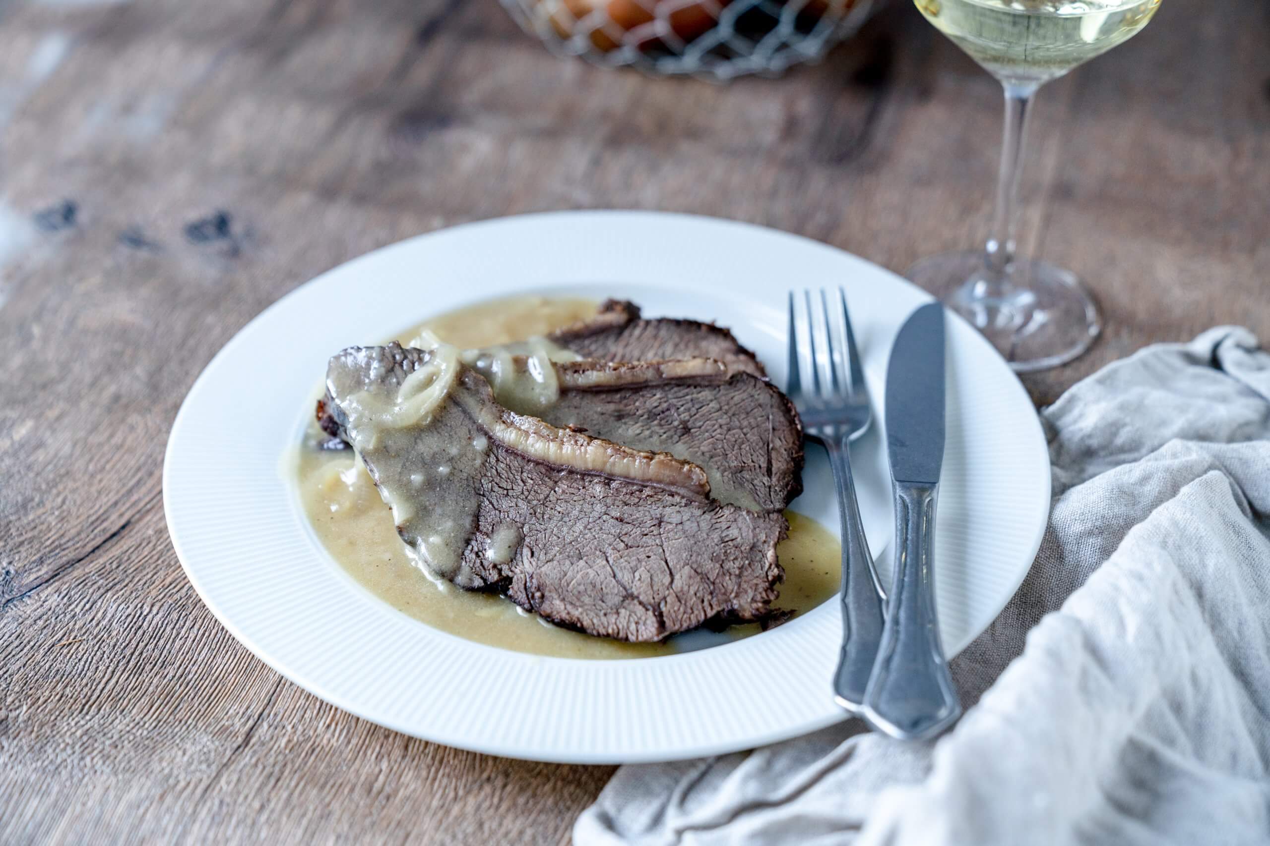 Tafelspitz aus dem Ofen holen, in dicke Scheiben schneiden und gemeinsam mit der Soße und einer Beilage eurer Wahl servieren.