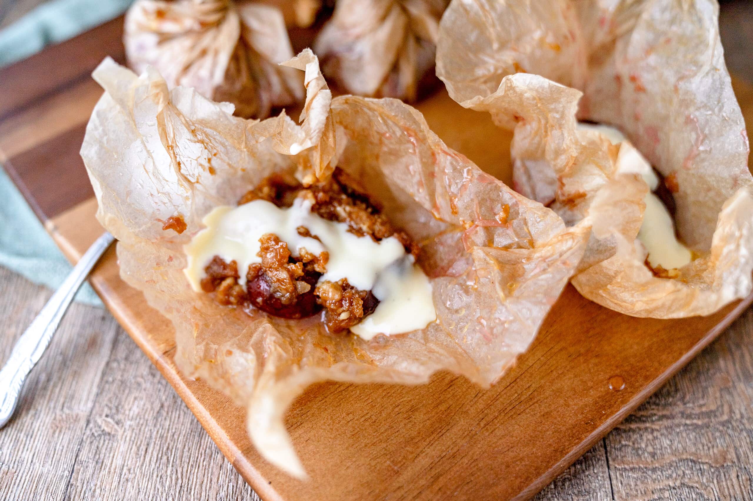 Die Zwetschgenpäckchen könnt ihr wunderbar mit Vanilleeis oder einer leckeren Vanillesoße servieren.